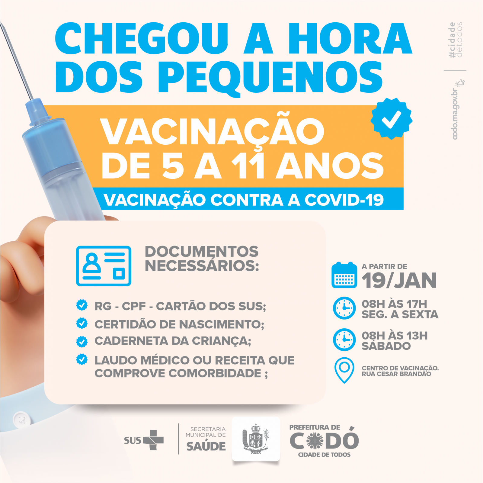 A prefeitura de Codó inicia a vacinação de crianças contra Covid-19 nesta quarta-feira (19), o primeiro grupo apto a receber o imunizante são aquelas que possuem alguma comorbidade ou deficiência entre 5 a 11 anos. Para este grupo, o imunizante estará disponível no Centro de Vacinação na Rua César Brandão, o atendimento ocorre das 08h às 17h de segunda a sexta e de 08h às 13h aos sábados.