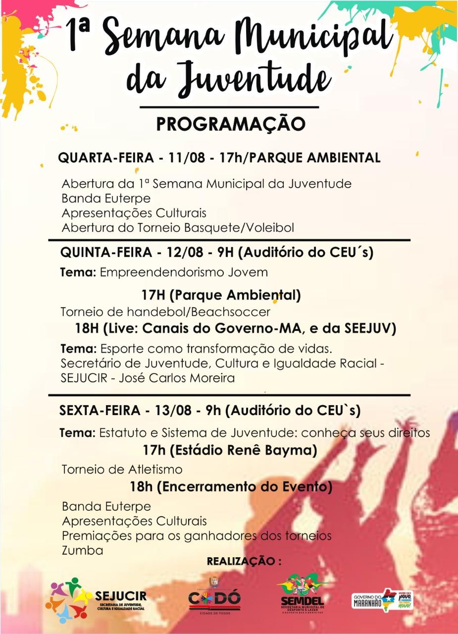 Com tema" Porque nós não passamos pela vida, nós a marcamos pela frente", a Prefeitura de Codó, promove de 11 a 13 de agosto a Semana Municipal da Juventude, organizada pela Secretaria Municipal de Juventude Cultura e Igualdade Racial (SEJUCIR) com o apoio da Secretaria de Desporto e Lazer (SEMDEL). Todas as atividades são gratuitas e vão acontecer no Parque Ambiental, CEU`S e Estádio Renê Bayma.